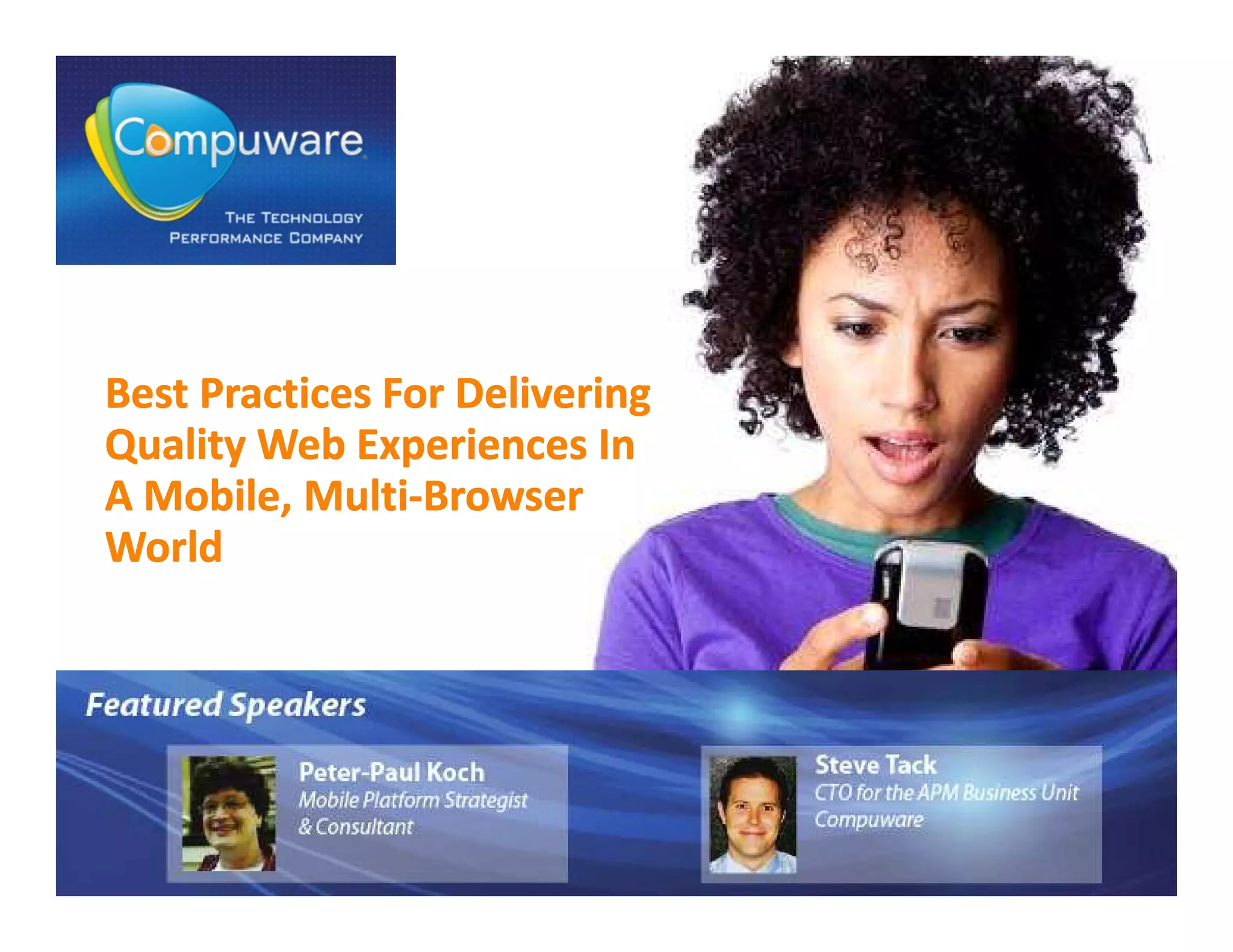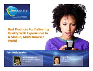 The document discusses best practices for delivering quality mobile web experiences across different browsers and devices. It recommends adopting an end-user point of view to understand their objectives and tailor the experience accordingly. Developers should leverage evolving browser capabilities to improve perceived performance and ensure applications work as intended on all customer devices. A "one web" approach applying common performance practices across mobile and desktop can improve efficiencies.