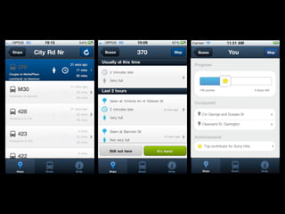 This document discusses designing for sharing personal informatics data. It suggests that personal informatics tools can be used immediately by building on existing behavior, in the short term through sharing data with others, and in the long term by using data for personal reflection and achievement tracking to support everyday activities. Examples are given of apps that track health, transportation, and activity data. The document concludes by crediting the designers of the example apps and providing sources for further information on personal informatics.