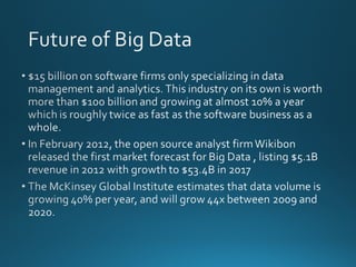 Big data is large amounts of unstructured data that require new techniques and tools to analyze. Key drivers of big data growth are increased storage capacity, processing power, and data availability. Big data analytics can uncover hidden patterns to provide competitive advantages and better business decisions. Applications include healthcare, homeland security, finance, manufacturing, and retail. The global big data market is expected to grow significantly, with India's market projected to reach $1 billion by 2015. This growth will increase demand for data scientists and analysts to support big data solutions and technologies like Hadoop and NoSQL databases.
