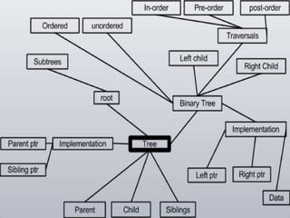 The document explains binary trees, defining a binary tree as a tree structure where each node has at most two children, and detailing the characteristics of complete and ordered binary trees. It discusses various operations such as insertion, deletion, searching, and different traversal methods, including pre-order, in-order, and post-order. Additionally, it outlines applications of binary trees in expression evaluation, data searching, and sorting, as well as different representations of binary trees.