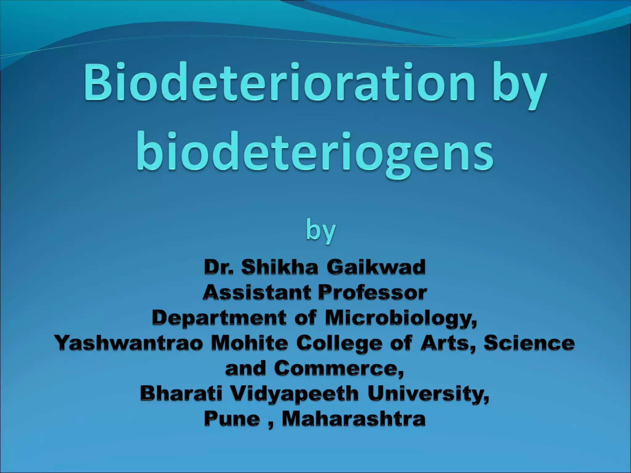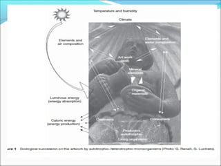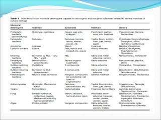 This document discusses biodeterioration, which refers to undesirable changes in materials caused by biological organisms. It affects buildings, stones, metals, and other materials. Factors like humidity, light, temperature, and pollution can influence biodeterioration by favoring the growth of microbes. Mechanisms include chemical and mechanical aggression via acids, enzymes, and physical forces produced by microbes. Common biodeteriogens are bacteria, fungi, algae, cyanobacteria, and plants. They can deteriorate inorganic materials like stones and metals or organic materials like paper, wood, and paintings. Control methods include biochemical, biological, physical, chemical, and mechanical approaches.
