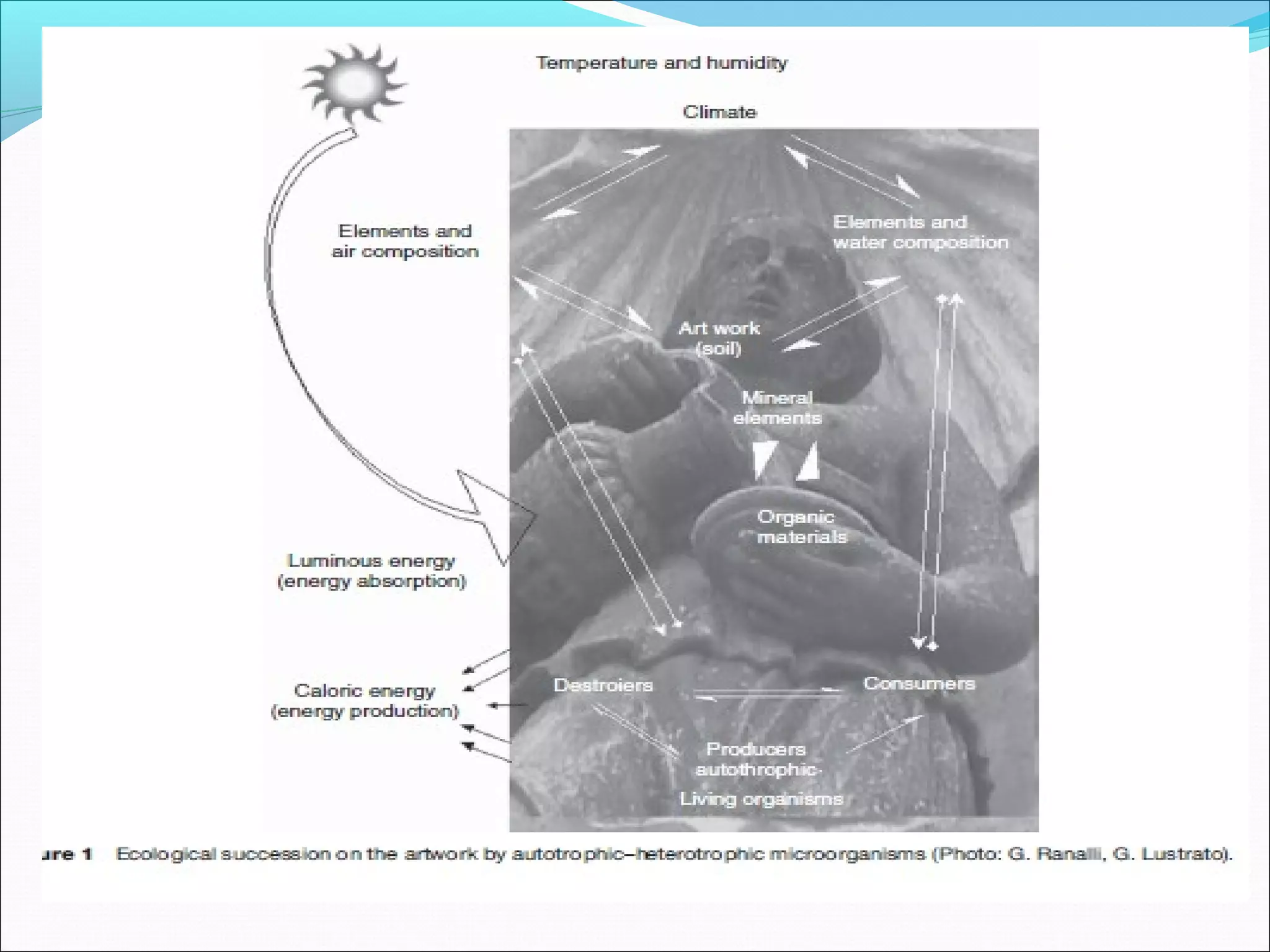 Historicalstone objects (sculptures, buildings,and rocks) and frescoes.