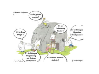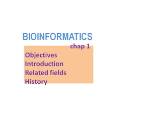 The document provides an introduction to the field of bioinformatics. It discusses how bioinformatics applies computer science to analyze large amounts of biological data from fields like molecular biology, medicine, and biotechnology. It also outlines some of the main topics that will be covered in the course, including biological databases, gene and protein analysis, phylogenetic analysis, and gene prediction.