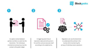 This document provides an introduction to blockchain technology including general concepts, how it guarantees security, and technical details. It discusses how blockchain uses cryptography to store data in a growing list of blocks that are linked together to form a distributed ledger. This ensures security and privacy without centralized control. Examples of potential blockchain applications are also given such as smart appliances, supply chain management, smart contracts for industries like healthcare, music, and government, as well as identity verification.