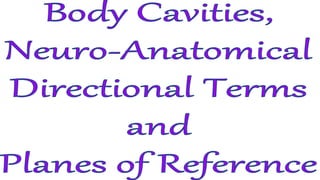 The document summarizes the major body cavities and their contents. It describes the dorsal cavity which contains the brain and spinal cord, including the cranial and spinal cavities. It also outlines the ventral cavity containing the thoracic and abdominopelvic cavities. The thoracic cavity is superior to the diaphragm and contains the lungs, heart and mediastinum. The abdominopelvic cavity is inferior to the diaphragm and contains the abdominal organs and pelvic organs.