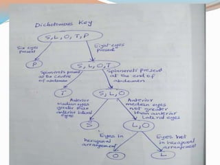 Indented Key A. Sixeyes present. . ……………………………..................................Pholcidae AA. Eight eyes present B. Spinnerets present at the end of abdomen C. Anterior median eyes greater than anterior lateral eyes…………………………..Salticidae CC. Anterior median eyes not greater than anterior lateral eyes D. Eyes present in hexagonal arrangement………………………........Oxyopidae DD. Eyes not present in hexagonal arrangement……………………….......Lycosidae BB. Spinnerets present at the centre of abdomen………...........................................Tetragnathidae