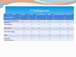 Cladogram  A diagramdepicting taxonomic relationship between organisms on the basis of shared derived characters. Out group  A group of organism not belonging to the group whose evolutionary relationships are being investigated.  Such a group is used for comparison to assess which characteristics of the group being studied are more widely distributed and may therefore be older in origin.