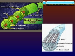 Myelination There aremillions of neurons, which form the electrical connections that let us think. These cells send their signals through axons, some of which can reach a length of up to a meter in humans. Wrapped around many of the axons are cells which form myelin sheaths, composed mainly of fat. These sheaths serve to insulate the axon, letting its signal travel about 100 times faster than in an unmyelinated axon.