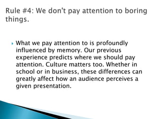 The document discusses neuroplasticity and "Brain Rules" from a book by John Medina. It summarizes that the brain can reorganize and form new connections throughout life in response to environment and thoughts. It provides overviews of 12 Brain Rules from the book, including that exercise boosts brain power, sleep is important for learning, stress hinders learning, and male and female brains differ.