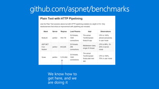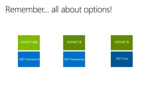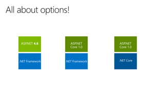 The document discusses .NET Framework 4.6 and .NET Core 1.0. .NET Framework 4.6 provides a full-featured .NET implementation for Windows, while .NET Core 1.0 provides a cross-platform implementation of .NET developed in an open source manner. Both frameworks include innovations like the next generation JIT compiler RyuJIT and SIMD, as well as shared runtime components, compilers, and libraries. ASP.NET Core 1.0 introduces a modular, cross-platform version of ASP.NET that is optimized for server and cloud workloads and allows easier transition from on-premises to cloud applications.