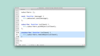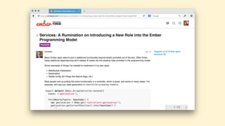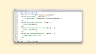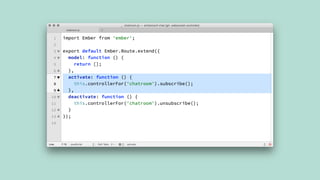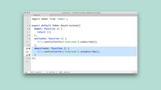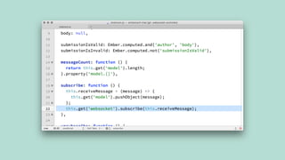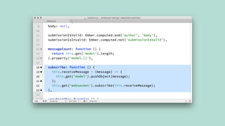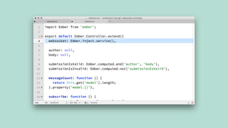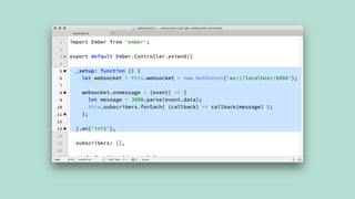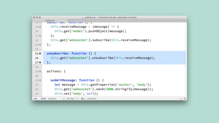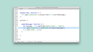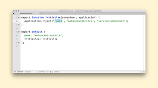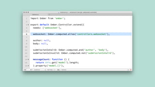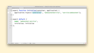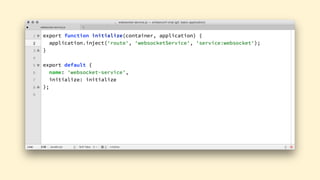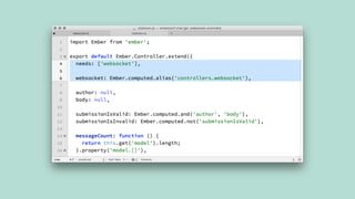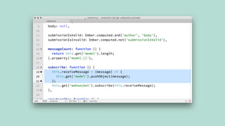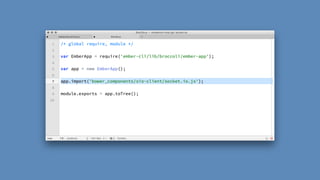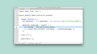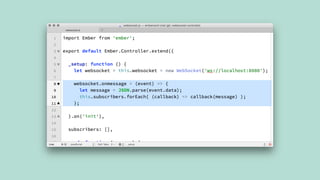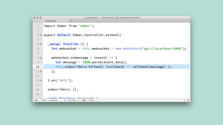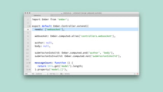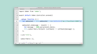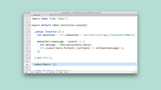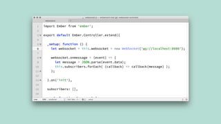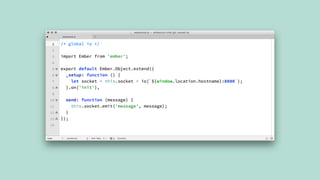 The document discusses building real-time applications using Ember and WebSockets, a protocol for bi-directional communication. It outlines the steps for implementing a WebSocket server and various approaches for integrating WebSockets within Ember applications. Additionally, it highlights the use of Socket.io as a versatile library for server and client-side functionalities.