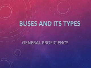 This document discusses different types of computer buses. It defines a bus as a communication channel that connects various computer components using cables. It describes the functions of buses in transferring data, addressing memory locations, and supplying power. It then discusses internal buses that connect internal computer components to the motherboard and carry data, addresses, and control signals. It provides examples of different internal buses like the data bus, address bus, and control bus. It also defines external buses that connect internal components to external devices like USB ports.