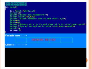 A pointer is a variable that stores the address of another variable. Declaration format: dataType *var_name.
