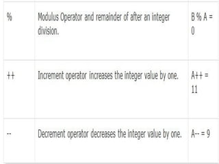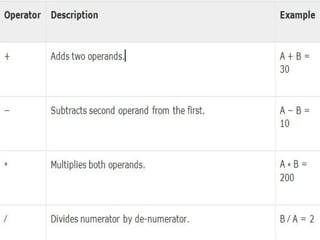 It defines key concepts like variables, data types (integer, float, character), operators (arithmetic, relational, logical), functions (printf, scanf), and basic program anatomy with main(), I/O statements, and comments. Examples are given to illustrate variable declaration and usage, arithmetic operations, type casting, and basic programs to read/write and perform calculations.