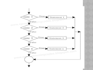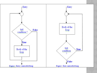 Overview of switch statements, including syntax, examples, and behaviors of unmatched cases.Introduction to loops in C, distinction between entry-controlled and exit-controlled loops.