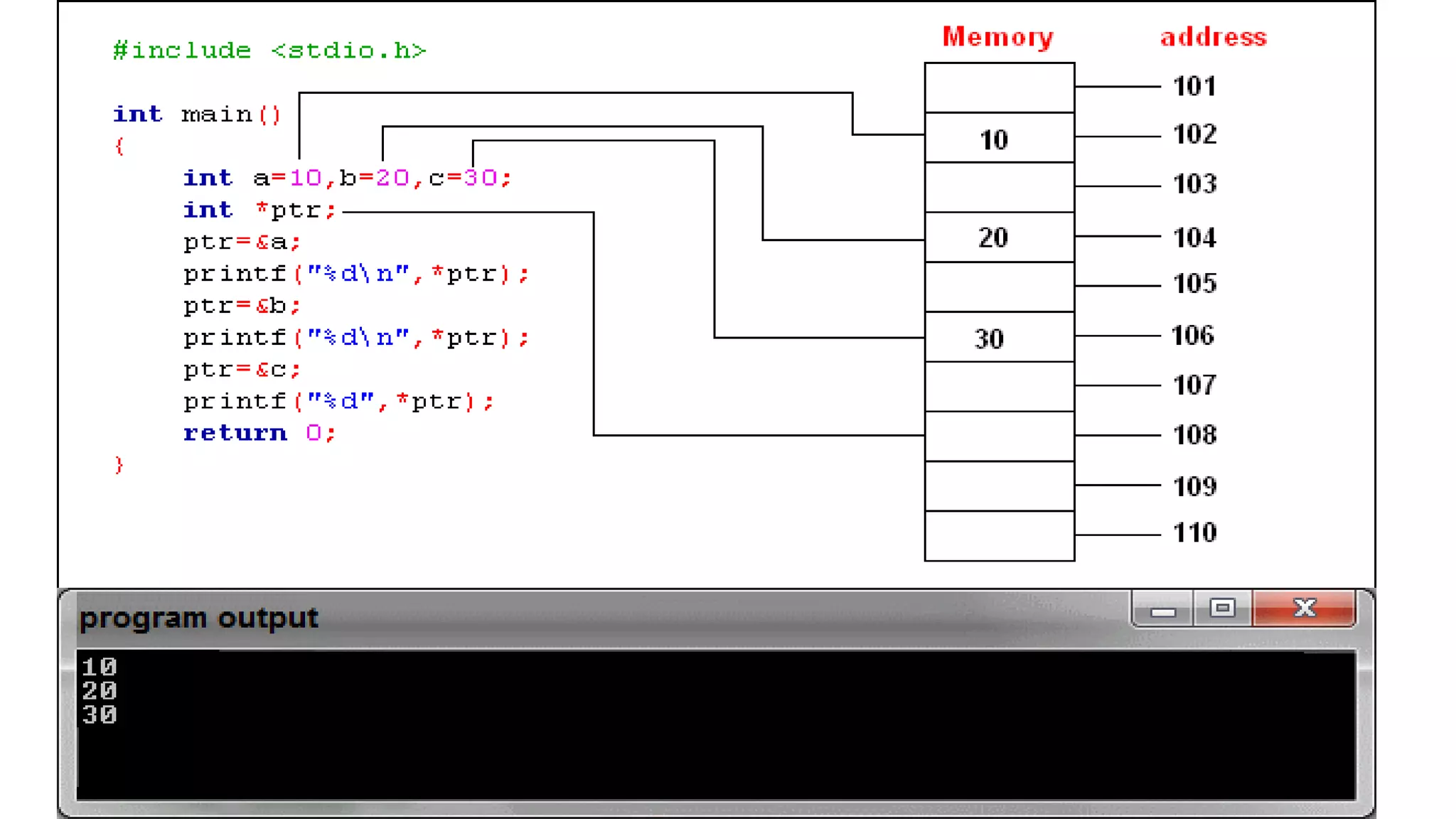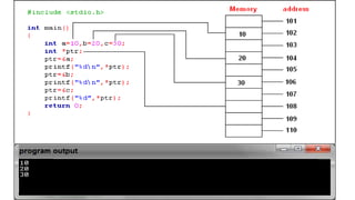 Pointers are defined as variables that store the memory addresses of other variables. Pointer operations like incrementing, decrementing, and arithmetic are described. The use of pointers to pass arguments to functions and access array elements is also demonstrated.