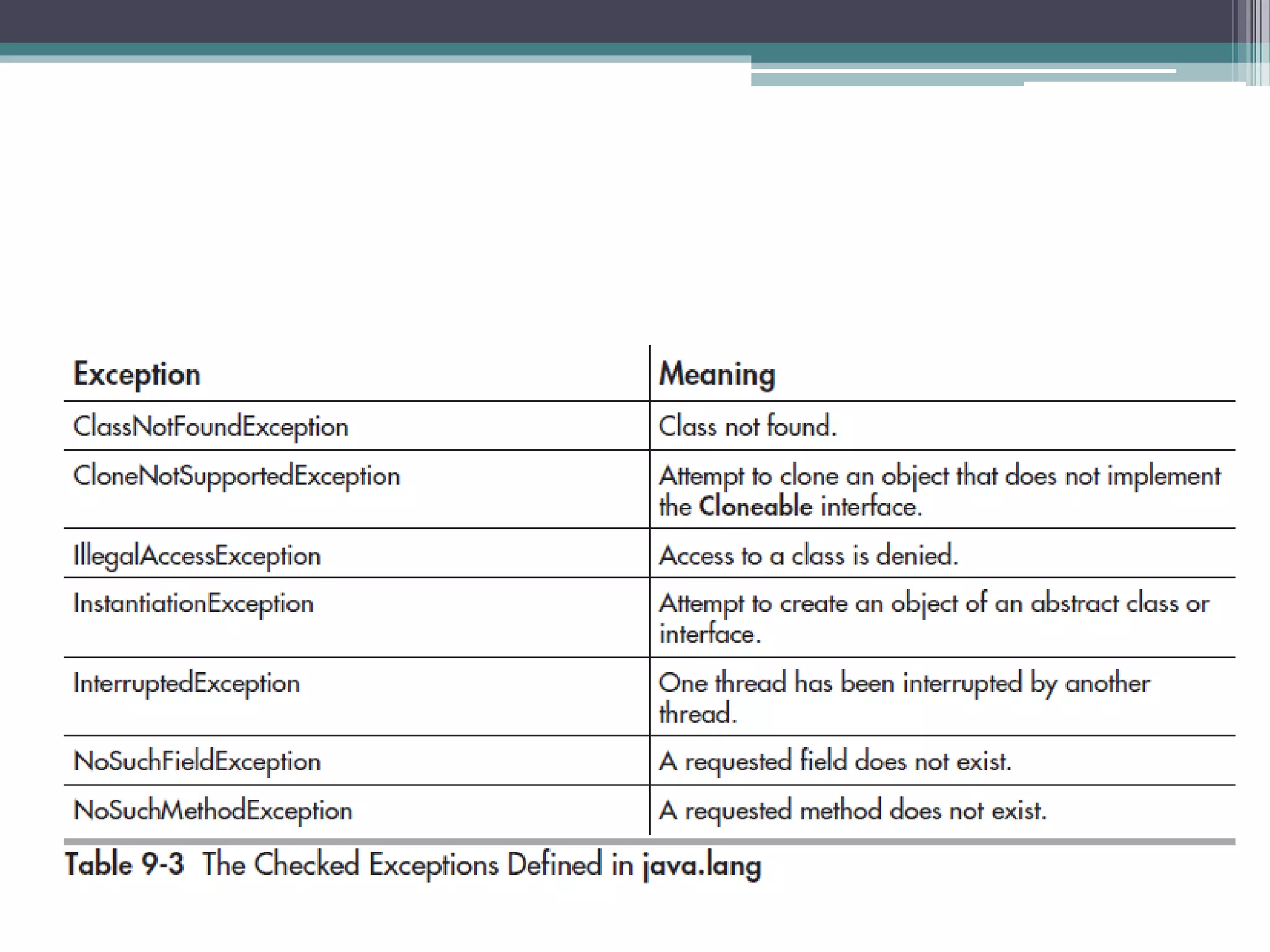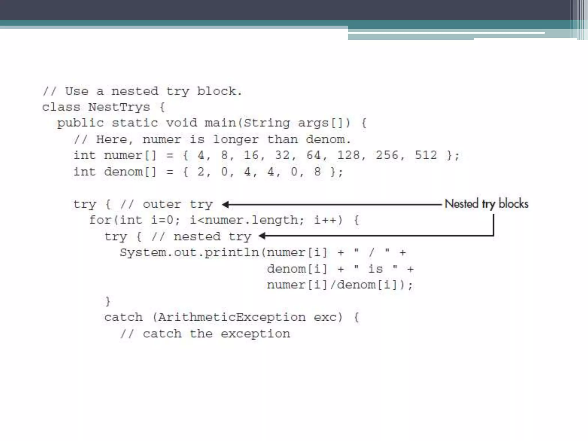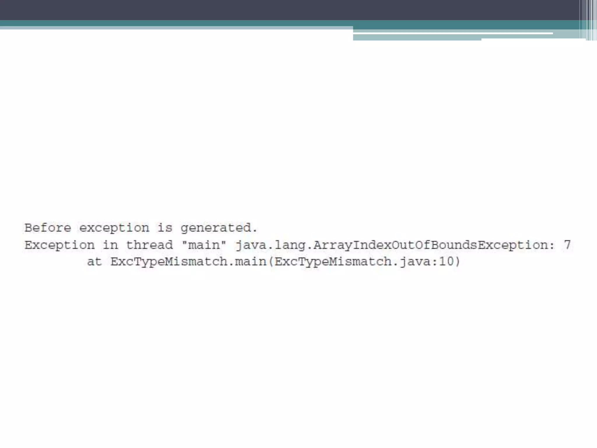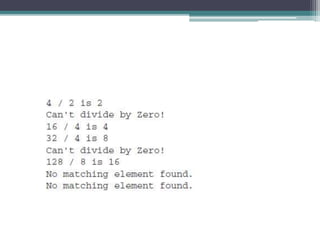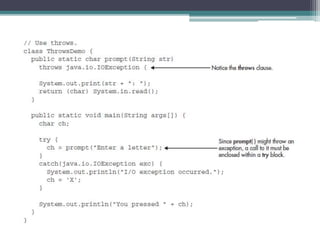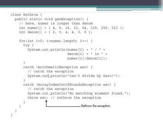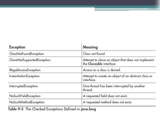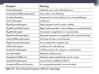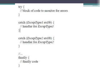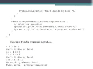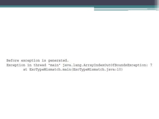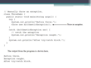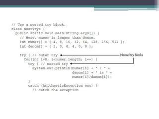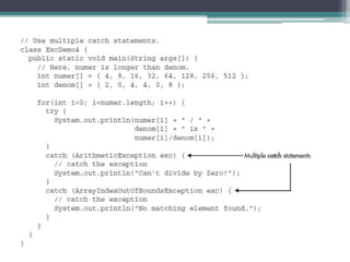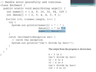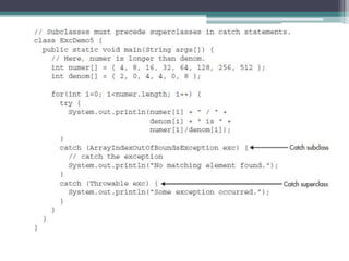 This document discusses Java exception handling. It covers the exception hierarchy, keywords like try, catch, throw, throws and finally. It explains how to handle exceptions, create custom exception subclasses, and Java's built-in exceptions. Exception handling allows programs to define error handling blocks to gracefully handle runtime errors rather than crashing.