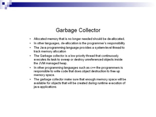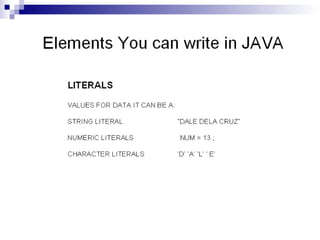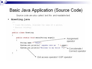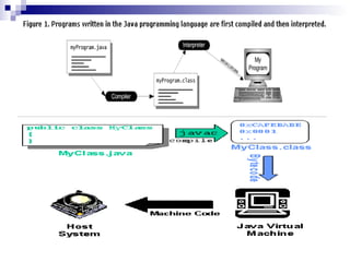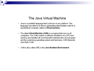 This document provides an introduction to Java programming, covering topics such as its origins, key features like being simple, object-oriented, distributed, interpreted, robust, secure, architecture-neutral, portable, high-performance, and dynamic. It also discusses how to program in Java, including the Java platform which consists of the Java Virtual Machine and Java Application Programming Interface, and different types of programs like applets, applications, and servlets.