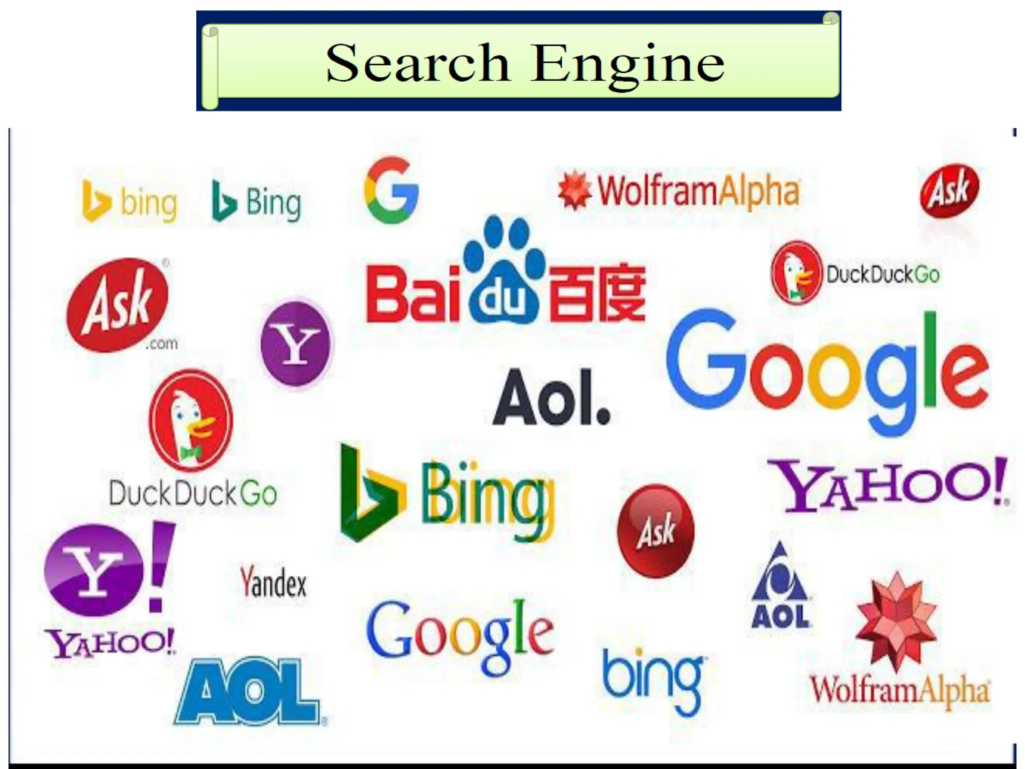 ➢ Examples: ( Google, Bing, Yahoo, Baidu, Yandex, DuckDuckGo, AOL and Ask)