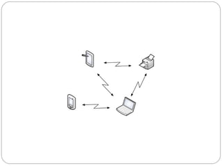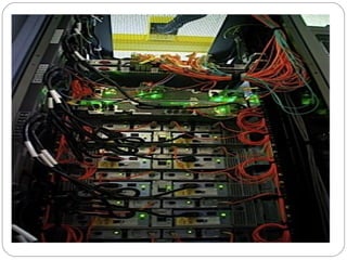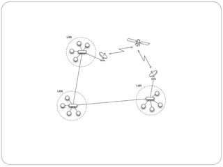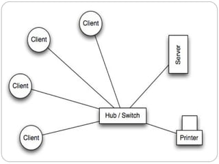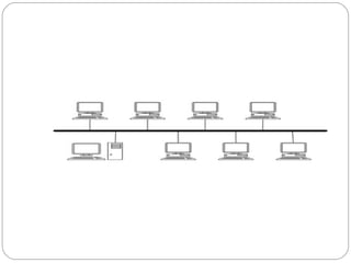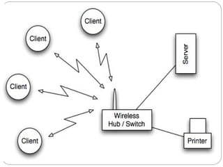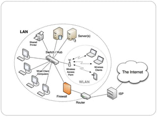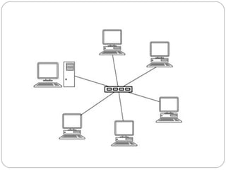 A network allows two or more electronic devices to connect and exchange data. Computers can be connected via cables, wireless connections, phone lines, or satellite links. Networks allow users to share files and resources, communicate, store data centrally, and access the internet for services, information, and entertainment. Special server computers provide centralized services to other computers on the network like file storage, printing, and user access control. Common network topologies include bus, ring, star, and hybrid configurations. Wireless networks use radio signals instead of cables. Network hardware like network interface cards, cables, hubs, switches, routers, firewalls, proxies, bridges, and modems facilitate device connections and data exchange within networks.