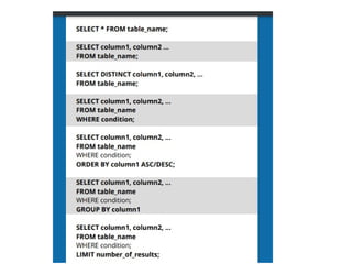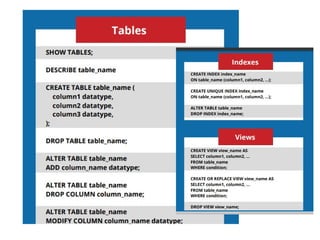 This document provides an outline of a SQL Lab tutorial covering MySQL. It introduces SQL and connecting to MySQL. It then covers various MySQL commands including administration commands, data definition language commands to create/drop databases and tables, data manipulation language commands to insert, retrieve, update and delete records, and more advanced queries using concepts like joins, aggregation, and pattern matching. SQL is introduced as a standard language for accessing and manipulating database systems and working with different database programs.