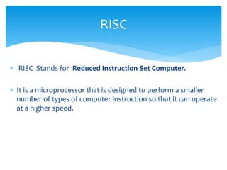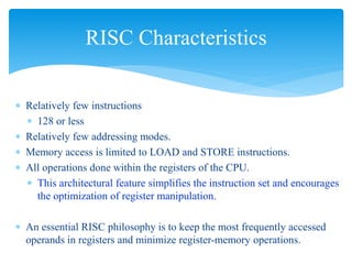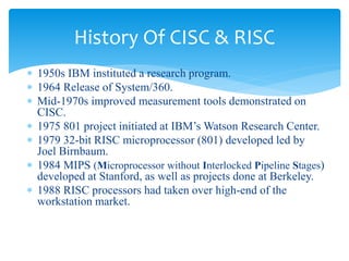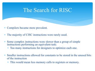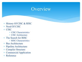 This document discusses the history and characteristics of CISC and RISC architectures. It describes how CISC architectures were developed in the 1950s-1970s to address hardware limitations at the time by allowing instructions to perform multiple operations. RISC architectures emerged in the late 1970s-1980s as hardware improved, focusing on simpler instructions that could be executed faster through pipelining. Common RISC and CISC processors used commercially are also outlined.