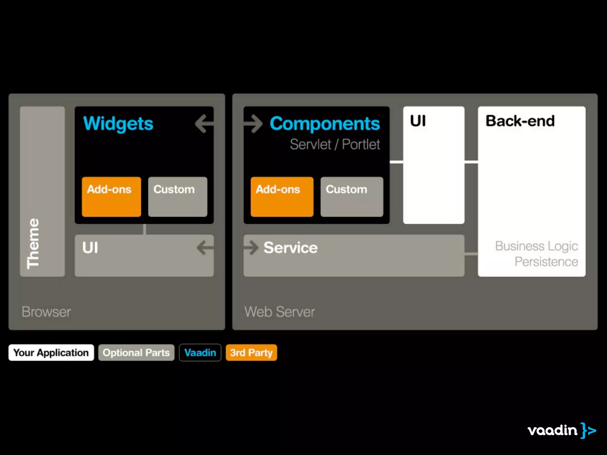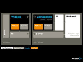 The document discusses a client + server hybrid architecture for applications using Vaadin. It involves layers of abstraction between the backend server and frontend web/JavaScript layers, with optional use of RPC, Java-to-JavaScript translation, and JavaScript. The architecture includes a widget on the client connecting via RPC to a component on the server, with state synchronization handled by the state object. Examples of implementations include specific widgets like HourList and views like BarView. Source code for a demo of the hybrid architecture is provided on GitHub.