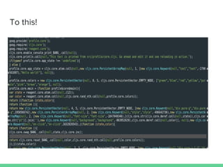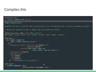 - The document discusses ClojureScript, a Lisp dialect that compiles to JavaScript. It provides an overview of ClojureScript's features like immutability, concurrency, and syntax extensibility through macros. It also summarizes popular ClojureScript tools like Lumo, Calvin, ShadowCLJS, and Macchiato and recommends options for getting started with ClojureScript depending on needs and preferences.