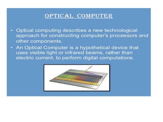 The document provides an overview of various computing paradigms, including high performance computing, parallel computing, and cloud computing, detailing their characteristics and applications. It discusses the importance of these paradigms in solving complex scientific problems and optimizing resource usage in different environments. Furthermore, it highlights the evolution towards advanced computing technologies like biocomputing, quantum computing, and optical computing, indicating the potential future of computing systems.