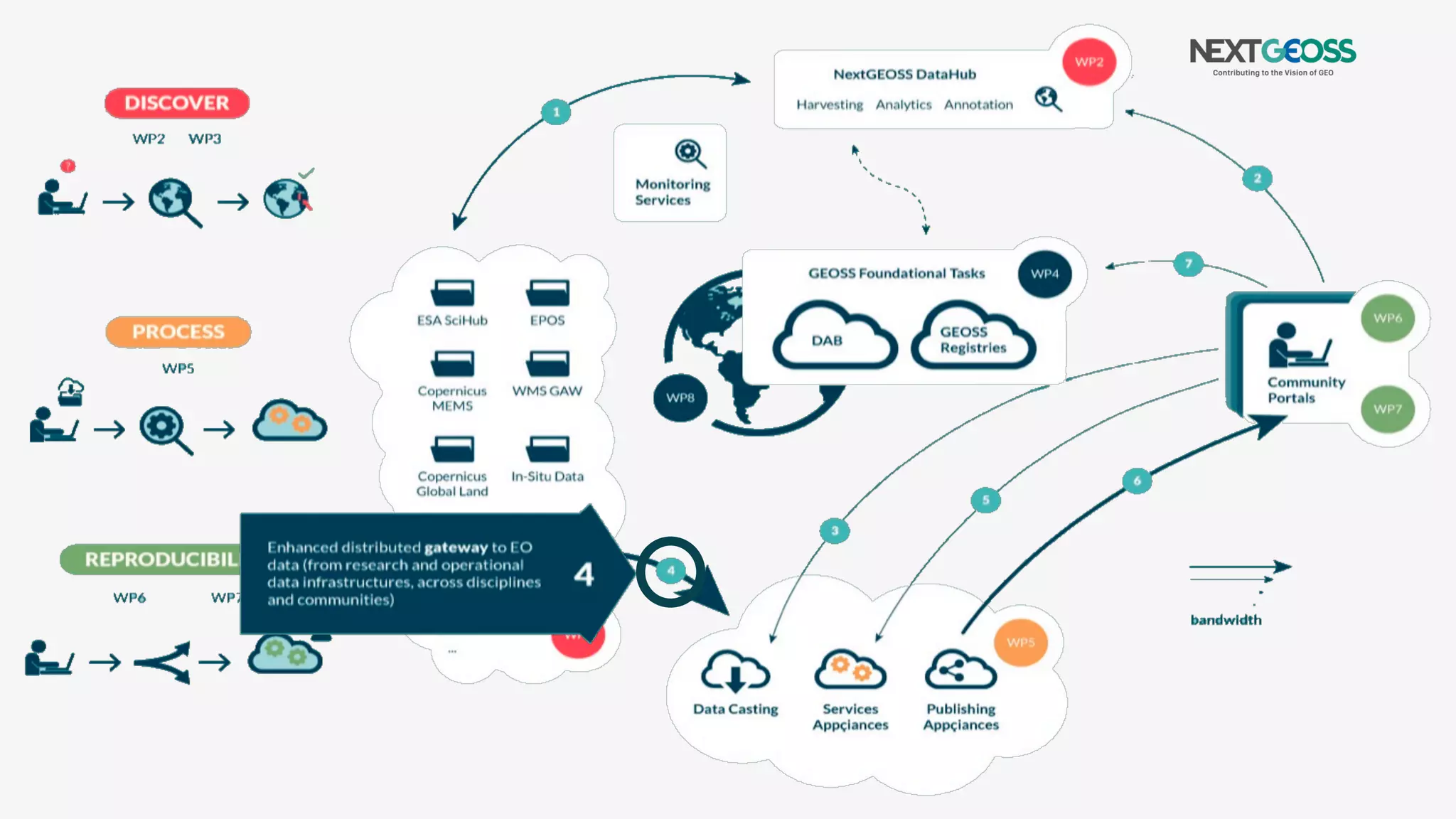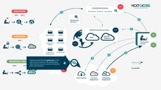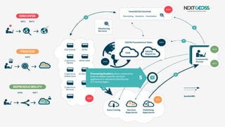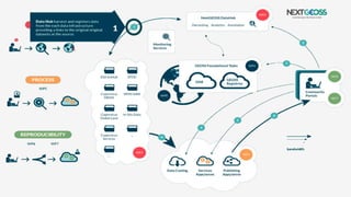 The document discusses the NextGEOSS initiative, aimed at improving access to Earth observation data through cloud processing and open data policies to support research and societal applications. It highlights the importance of long-term earth observation data in addressing challenges such as climate change, biodiversity loss, and resource management, while emphasizing collaboration among public and private sectors. The initiative focuses on creating a federated data hub, empowering users with advanced tools for data access, analysis, and application development.