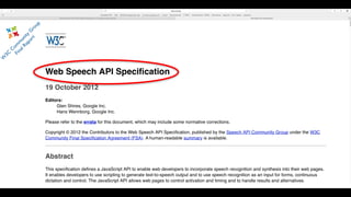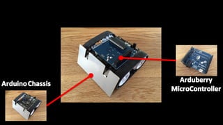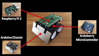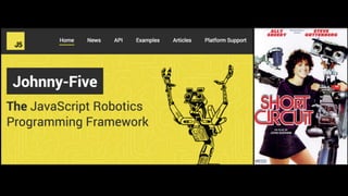 This document discusses building a Node.js powered robot using a Raspberry Pi, Arduino, sensors, actuators and Johnny-Five. The robot hardware includes a Raspberry Pi 2, camera, Arduino, servos and chassis. Johnny-Five is used to control the hardware from JavaScript. An MQTT message broker allows components to communicate. Speech recognition is also demonstrated using HTML5 for additional control capabilities.