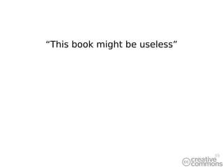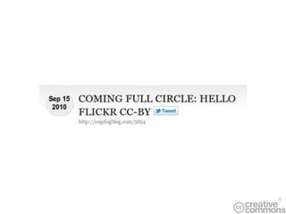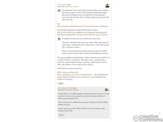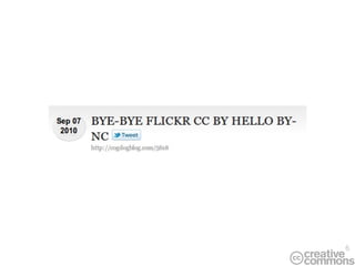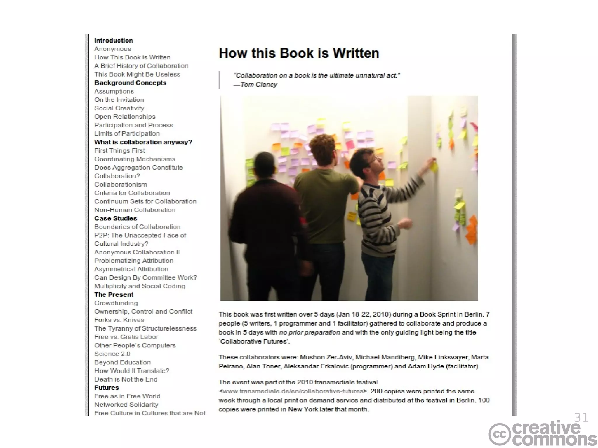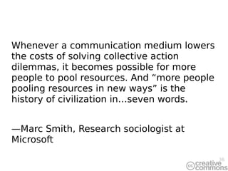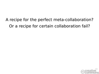 The document summarizes a talk given by Mike Linksvayer on collaborative futures and how increasing collaboration through open licensing and peer production can help create positive futures. It discusses how Creative Commons licenses work to enable widespread sharing and collaboration. It also notes many benefits of open collaboration including increased innovation, security, and participation. The talk argues for continued building of the digital commons to facilitate collective intelligence and ensure freedom remains online.