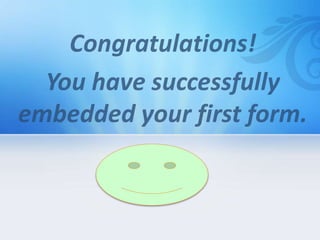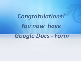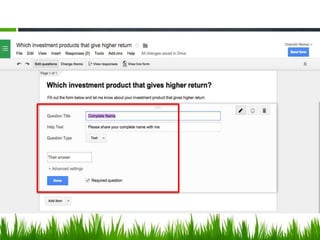 This tutorial explains how to create a questionnaire or survey using Google Docs Forms, allowing responses to be collected automatically in a Google Spreadsheet. It provides step-by-step instructions for setting up a form, adding questions, and sharing the form via social media or embedding it in a blog. The document highlights the ease of managing responses and customizing the form interface.