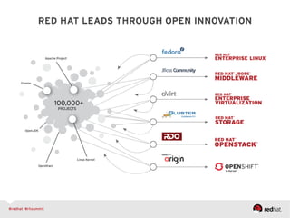 The document discusses the significance of open source software and its inherent freedoms, highlighting various case studies to illustrate the positive impact on customers and communities. It outlines the importance of engaging with open source projects for better software quality and encourages participation in the ecosystem. Additionally, it lists specific projects like Wildfly, Fedora, and OpenShift, providing links for community involvement.