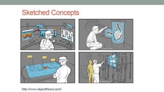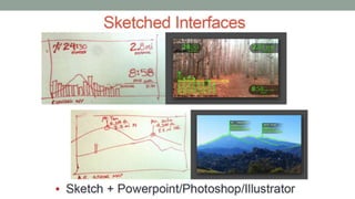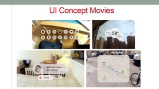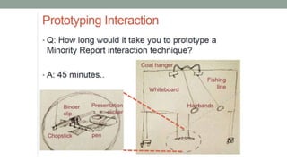 The document discusses various optical tracking methods for augmented reality (AR), including marker tracking, markerless tracking, and simultaneous localization and mapping (SLAM). It explores hybrid tracking interfaces that combine multiple technologies and details different types of AR interactions, such as browsing, 3D AR, and tangible interfaces. Key concepts in interaction design and prototyping for XR experiences are also highlighted, emphasizing the importance of iterative prototyping and the use of tools for effective user experience design.