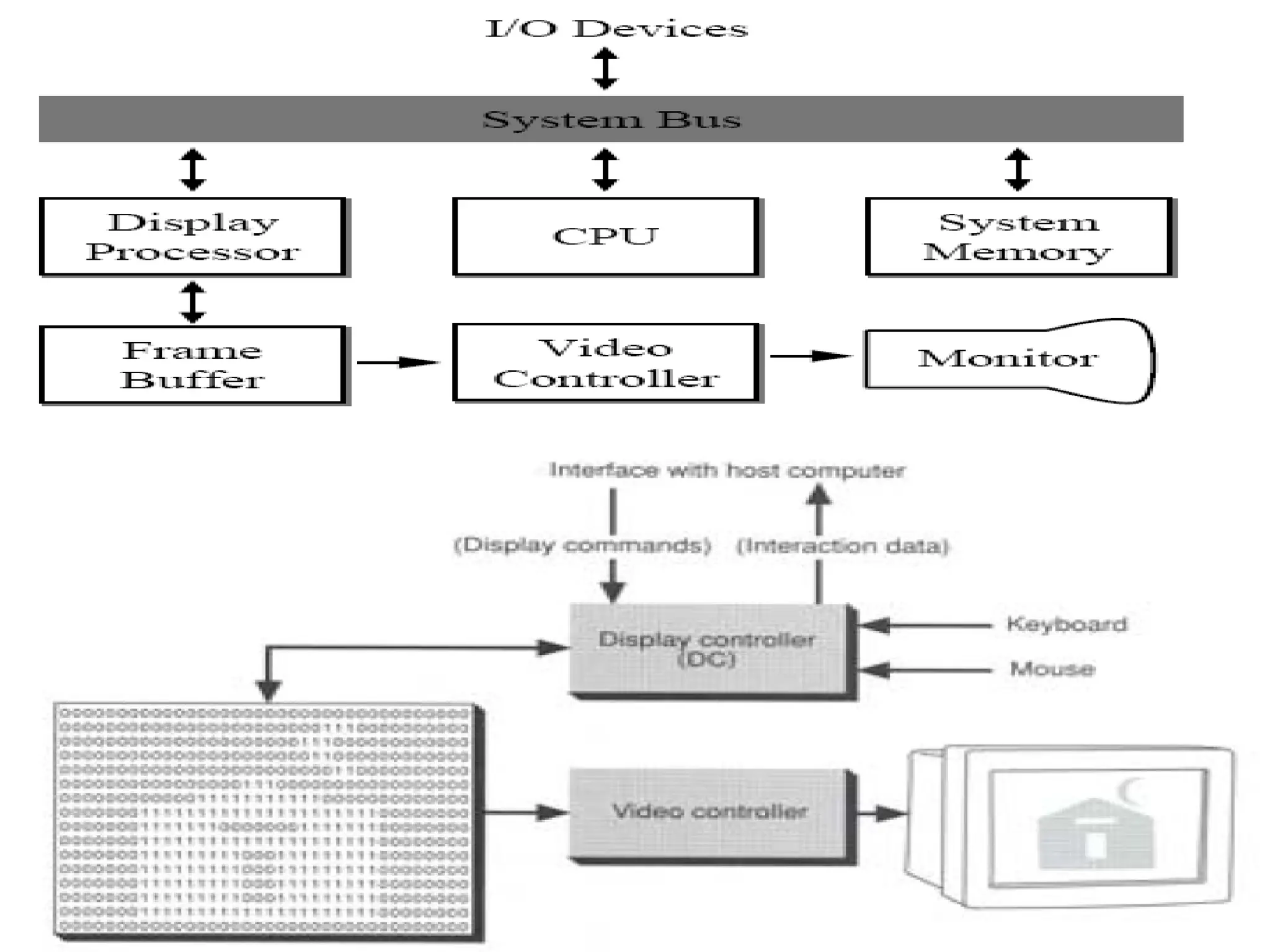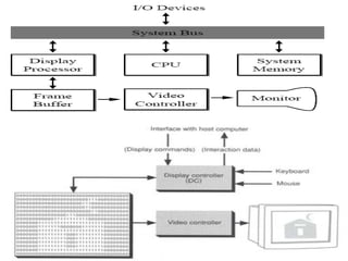 The document discusses two types of display systems: raster scan and random scan displays. Raster scan images are created using an array of pixels and require a refresh buffer to store pixel intensity values, while random scan displays, also known as vector displays, utilize geometrical primitives and draw images line by line. Each system has distinct advantages and disadvantages in terms of image quality, refresh rates, and applications.