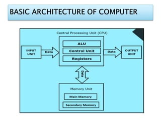 This document presents a detailed overview of computer hardware, outlining its main components: input devices, processing units, output devices, and memory types (cache, primary, secondary). It describes the roles of each component, including the CPU (which consists of the ALU, control unit, and memory registers), and explains various memory storage technologies and their characteristics. Additionally, it covers types of storage devices, their advantages and disadvantages, and the structure of motherboards.