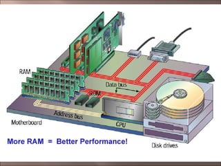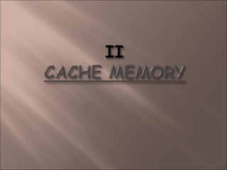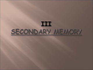 Memory is essential for computers and comes in three main types: primary, cache, and secondary. Primary memory (RAM) is directly accessible by the CPU and comes in volatile forms like DRAM and SRAM. Cache memory improves access speed and can be L1/L2 caches. Secondary memory (hard disks, DVDs) provides large storage but is slower to access. The document discusses these memory types in detail along with their technologies and principles.