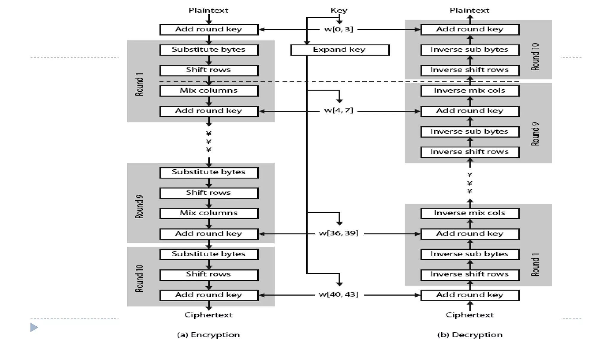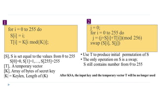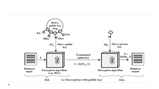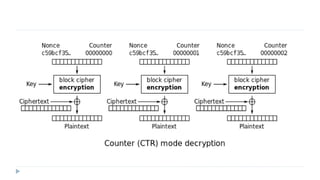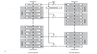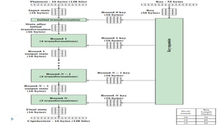 The document provides an in-depth overview of the Advanced Encryption Standard (AES), focusing on its design, structure, and security features. AES, a symmetric block cipher developed by Rijmen-Daemen, is intended to replace DES and 3DES, offering resistance to known cryptographic attacks and efficient performance. It details various encryption processes, key expansion, and modes of operation, alongside other encryption methods like RC4 and the importance of key distribution in symmetric encryption.
