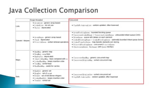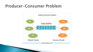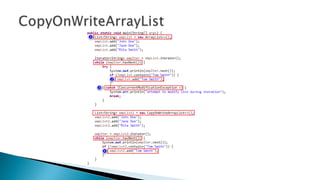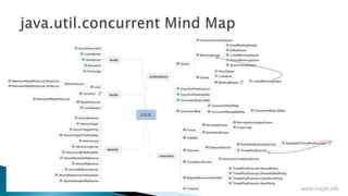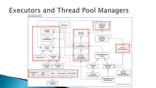 The document discusses key concepts related to threads and concurrency in Java. It defines processes, threads, and the Java memory model. It then covers various concurrency utilities in Java like synchronized blocks, volatile fields, atomic classes, thread pools, blocking queues, and locking mechanisms like ReentrantLock. The last part discusses high-level concurrency constructs like semaphores, latches, barriers, and phaser.