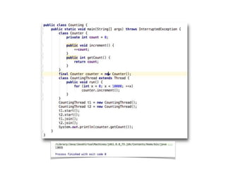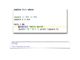 The document discusses concurrency and parallel programming, highlighting the differences and applications of both concepts. It covers various topics such as multi-core CPUs, functional programming, and the history of programming languages like Haskell and Elixir, along with their respective use cases. Additionally, it touches on challenges related to threads, race conditions, and deadlocks while mentioning tools and features for effective programming.