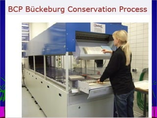 The document details the distinction between preservation and conservation in library and archival science, emphasizing preservation as maintaining access to records and conservation as the treatment of individual documents to prevent decay. It outlines the essential components of a conservation program, including policy formulation, staff responsibilities, environmental assessments, and various conservation techniques. The document also addresses digitization as a preservation strategy and highlights legal, ethical concerns, and best practices in handling archival materials.