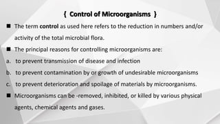 This document discusses controlling microorganisms using temperature. It explains that microorganisms have minimum, optimum and maximum temperatures for growth. Temperatures below the minimum inhibit growth by slowing metabolism, while temperatures above the maximum usually kill microorganisms by denaturing enzymes. Low temperatures like refrigeration and freezing inhibit growth. High temperatures like moist heat at 50-70°C can kill vegetative microbes, while endospores require extended exposure to higher heat. Methods of applying high temperature include dry heat through oven sterilization or incineration, and moist heat through pasteurization, fractional sterilization, boiling or autoclaving.