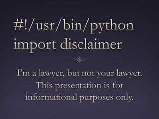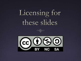 This document discusses copyright and licensing. It explains that copyright law governs how others can use your work and software, whether you must share source code, and how much you could be sued for infringement. It describes different types of licenses from closed licenses to open licenses like BSD and GPL, distinguishing between non-viral and viral licenses. Fair use is discussed as an exception that allows limited use of copyrighted works. The history of open source licensing and newer visual licenses are also covered.