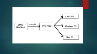 This document provides an introduction to the Java programming language. It discusses the history and creation of Java, its key features such as being platform independent and object oriented, common uses including desktop, web, and mobile applications, and different Java platforms. It also includes a simple "Hello World" Java program example to demonstrate how to write, compile, and run a basic Java program. Finally, it lists the major versions of Java released since 1996.