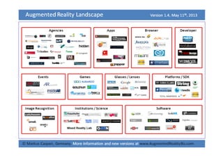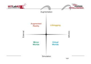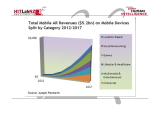The document outlines a course on augmented reality (AR) led by Mark Billinghurst, covering topics such as AR technology, interaction techniques, and authoring tools. It includes a detailed course outline, assessment methods, and a brief history of AR development from the 1960s to present day. The document also highlights various applications of AR in fields like medicine, gaming, and marketing, and emphasizes the rapid growth and commercialization of AR technologies.