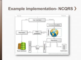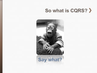 This document discusses Command Query Responsibility Segregation (CQRS), a pattern for building scalable, multi-user systems. CQRS separates commands and queries by using different models for updates and reads. This allows optimization of read and write operations independently to improve scalability. The document outlines common CQRS components like commands, events, and persistent view models, and provides guidelines for when to use CQRS, such as for large, distributed systems with complex business logic.