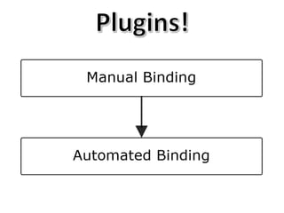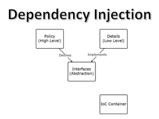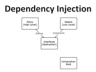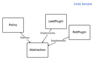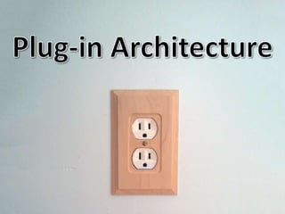 The document discusses creating a plug-in architecture in .NET. It defines a plug-in as an external piece of functionality that can be added to a system by following a predefined contract. Developing with a plug-in architecture allows splitting work across boundaries, incremental feature deployment, and only deploying updated modules without source access. Challenges include managing contract changes and increased development time for small projects.