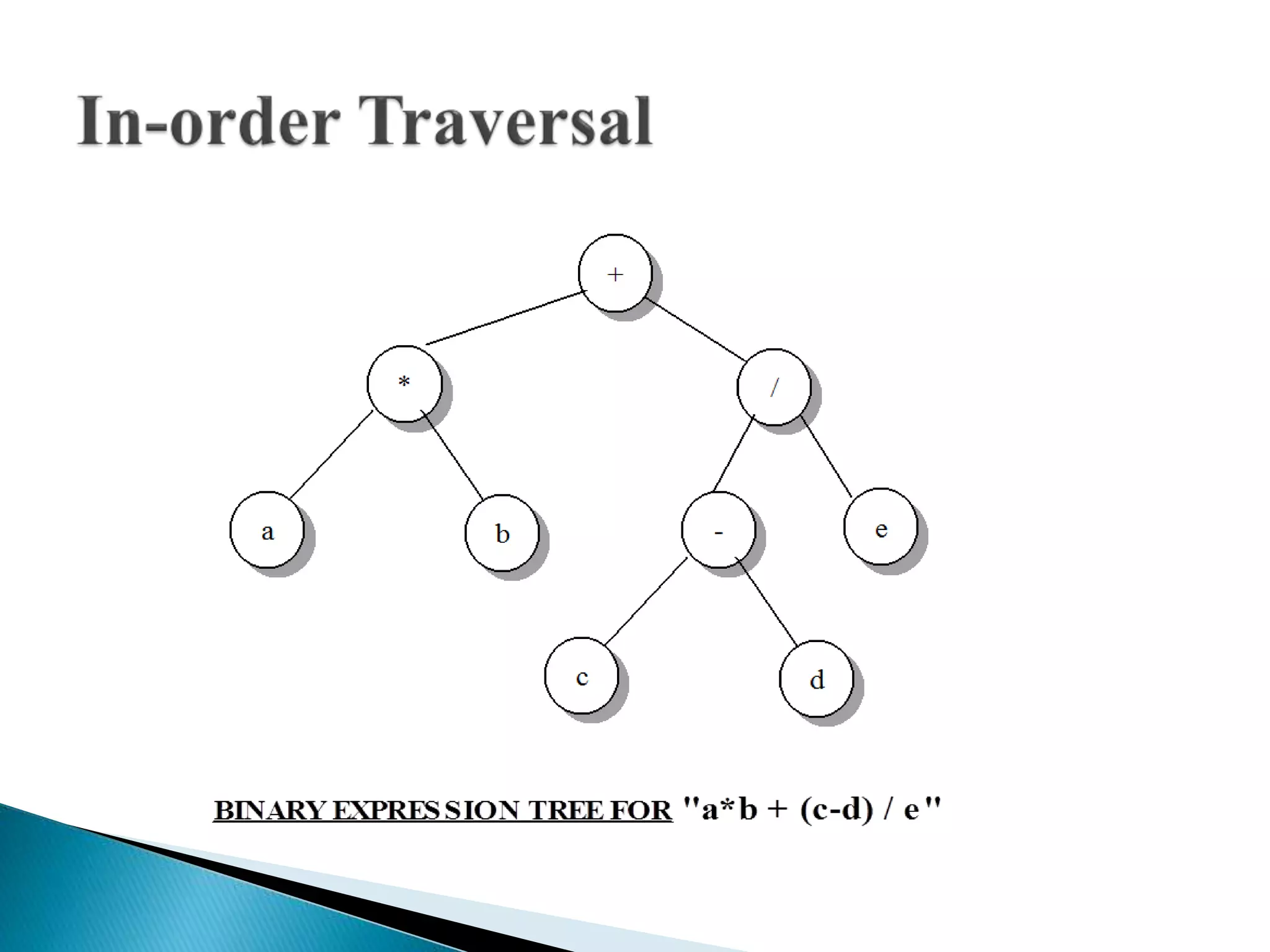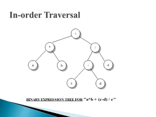 This document presents a binary tree overview, detailing its structure and properties, such as nodes, roots, leaves, and relationships among them. It also describes different types of trees, including full, perfect, and complete trees, and discusses traversal methods. The presentation is prepared by a group as part of an academic assignment.