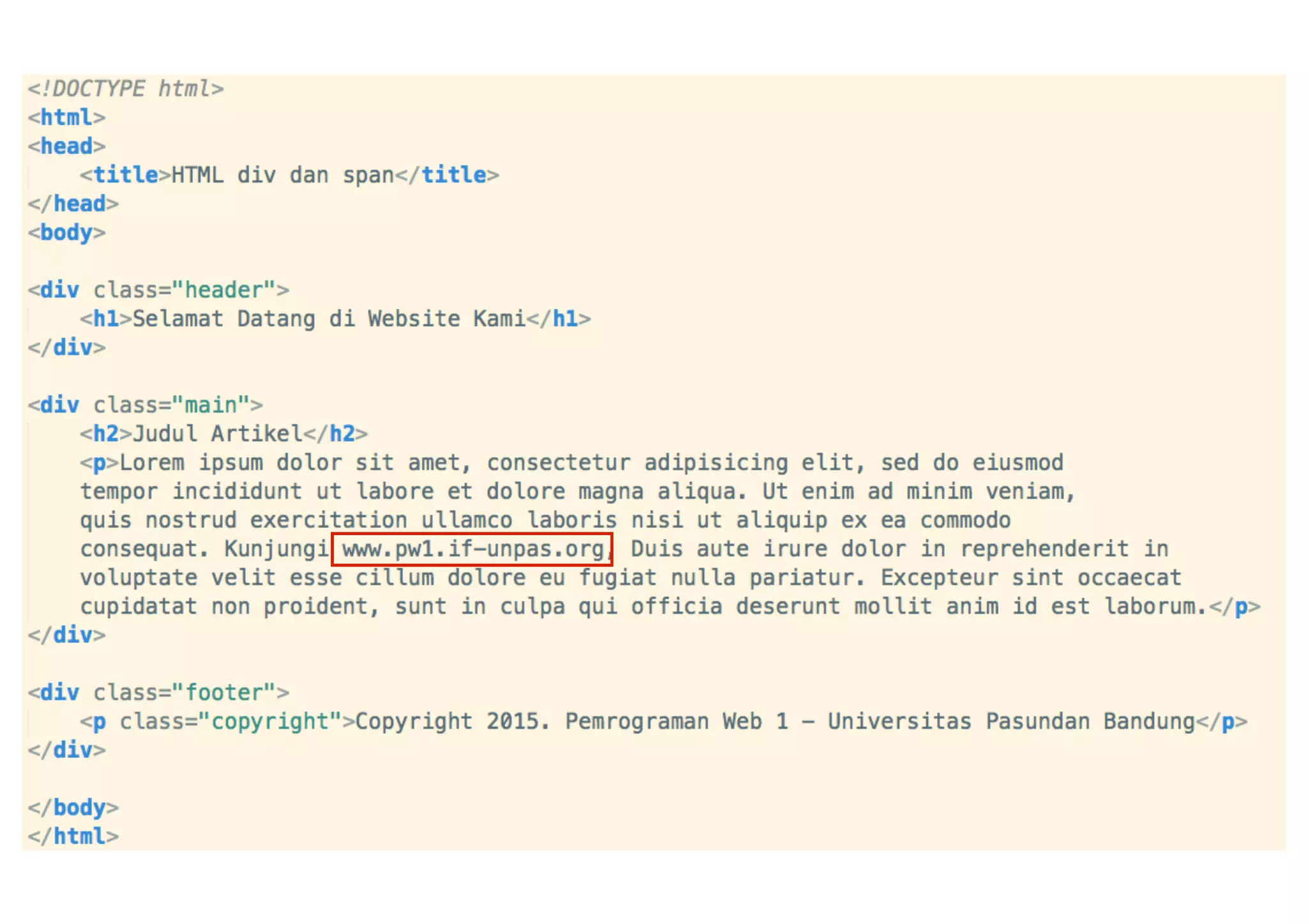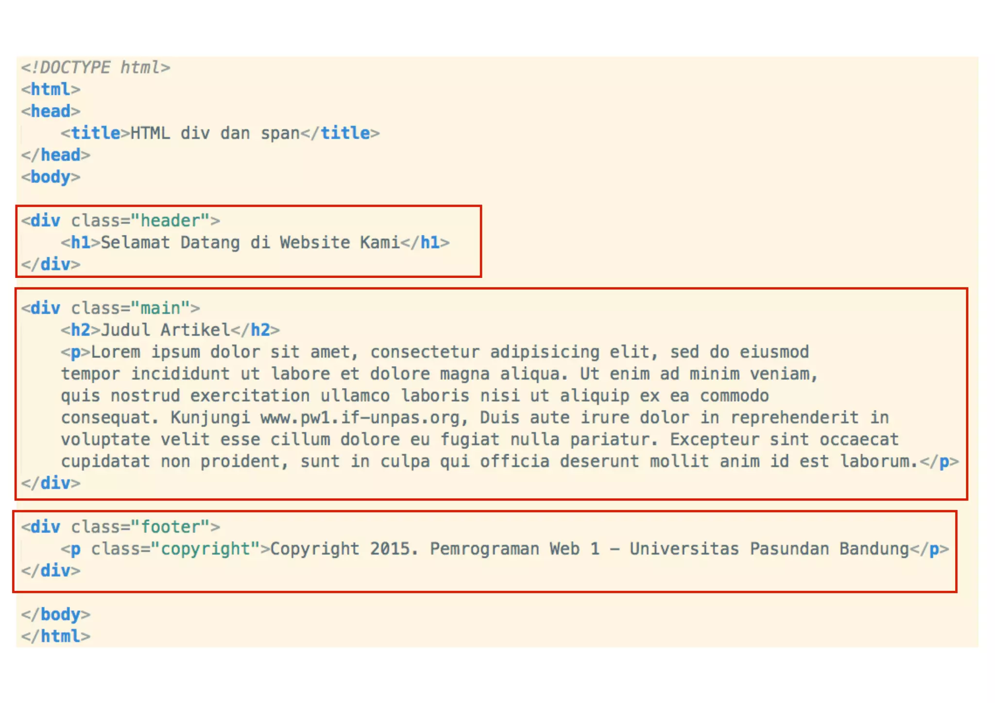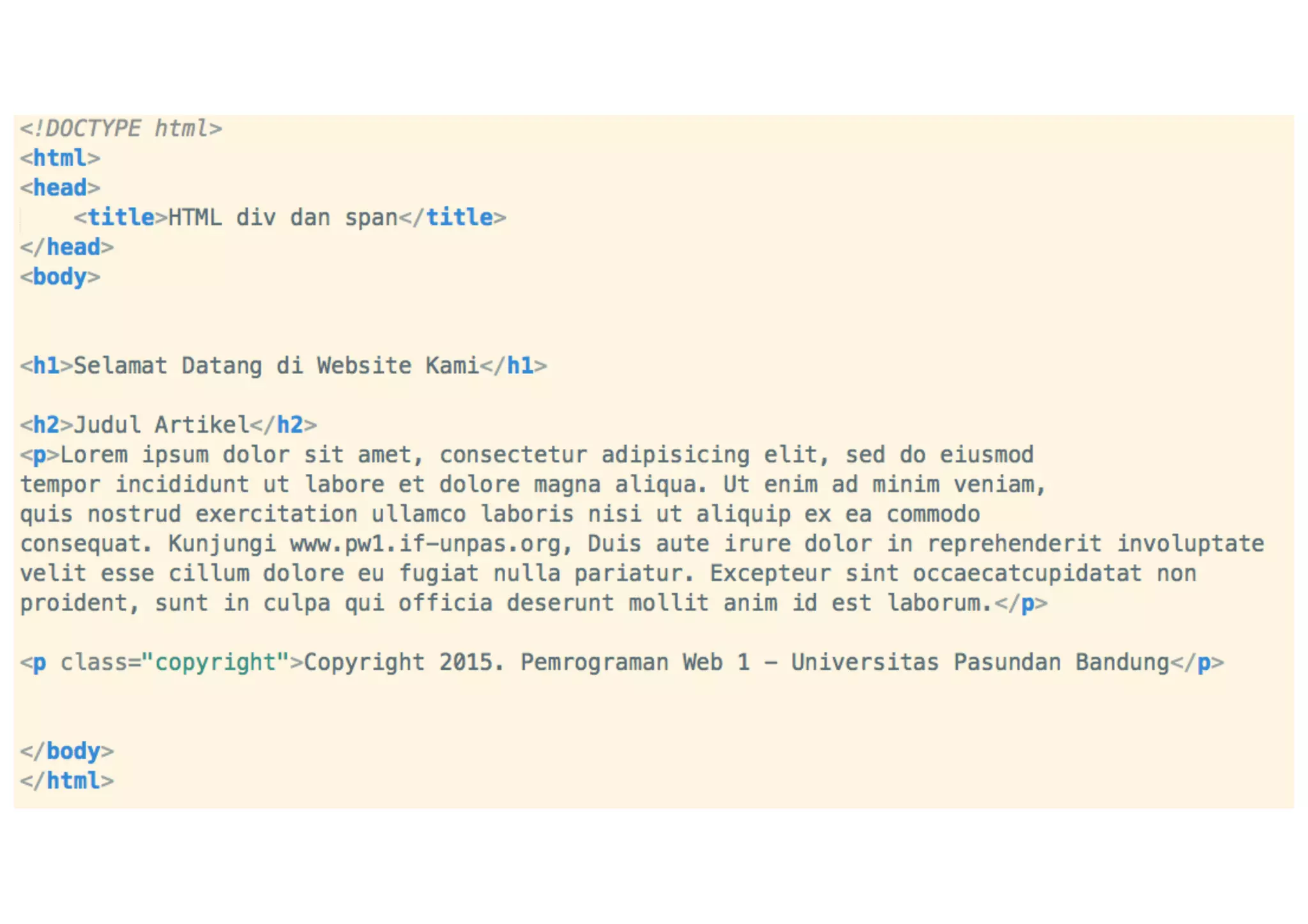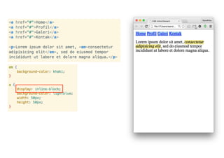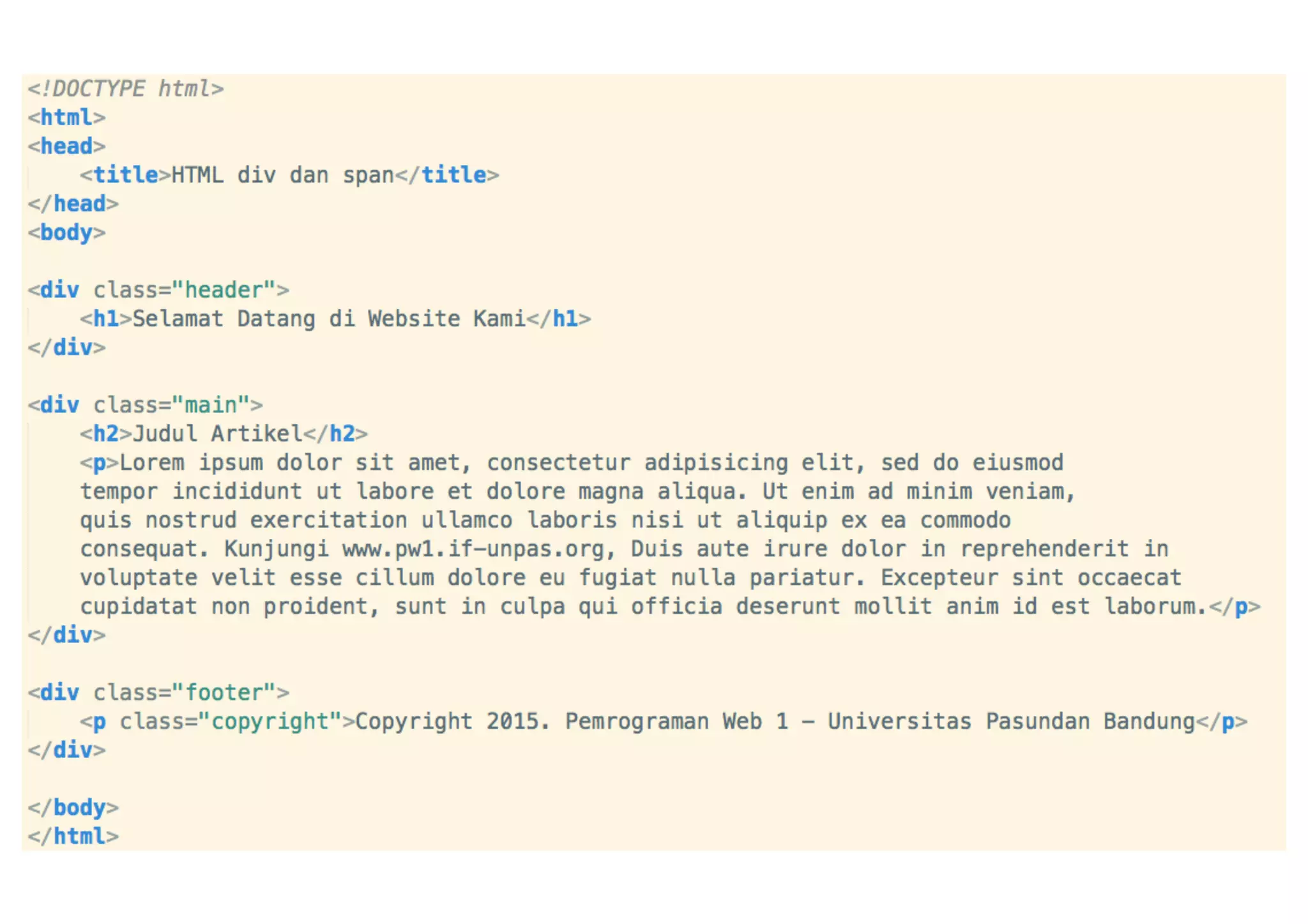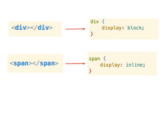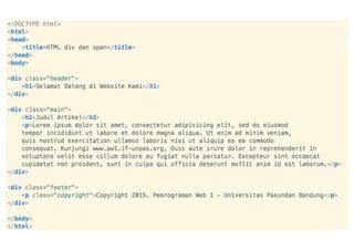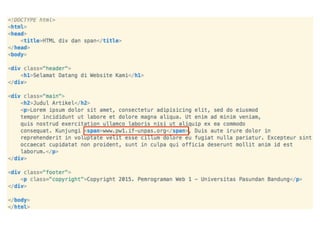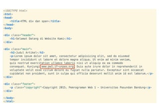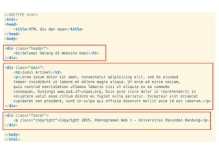 Dokumen ini menjelaskan penggunaan tag <div> dan <span> dalam HTML yang tidak memiliki arti tetapi digunakan untuk pengelompokan. Selain itu, dijelaskan berbagai nilai properti display CSS, seperti inline, inline-block, dan block, yang mempengaruhi perilaku elemen HTML dalam tata letak. Setiap elemen memiliki nilai default untuk display, namun perilaku ini dapat diubah sesuai kebutuhan.